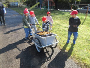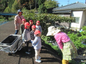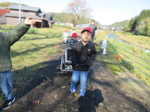 帰りは、重たいかごをみんなで力を合わせて