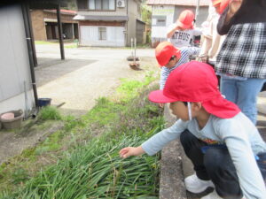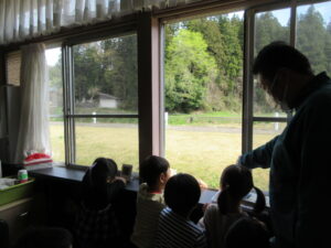 朝の会で、保育者が“雪椿祭り”に行ったことを話したり