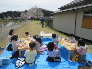 さて、保育園に戻ってからは満開の桜を見ながらの「お花見昼食会♪」
