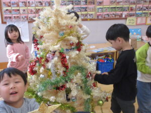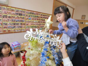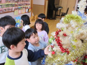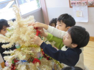 みんなでクリスマスツリーに飾りをつけました(*’ω’*)