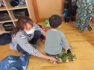 「どーやって きればいいの?」と保育者や友だちに聞きながら、