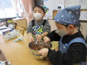 バレンタインにちなんで、らいおん組でチョコレート作りをしました♪