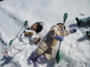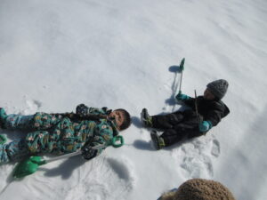 誰の足跡もついてない雪の上で「せんせいみてーすわったよ!」「ねてみたよ!」「きもちいい!」といい笑顔(^▽^)/