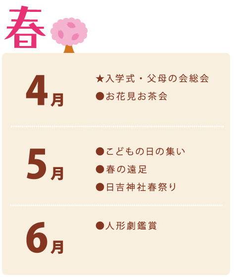 ●身体測定 ●誕生日会 ●避難訓練 年2回実施 内科検診と歯科検診は年に2回実施します。 検診を受ける事で、安心して園生活が送れます。 ●花の苗植え ●季節の野菜を育て収穫 父母の会主催の行事 親子バス遠足はその年により有無・実施月などを決定しお便りやホームページでお知らせ致します。